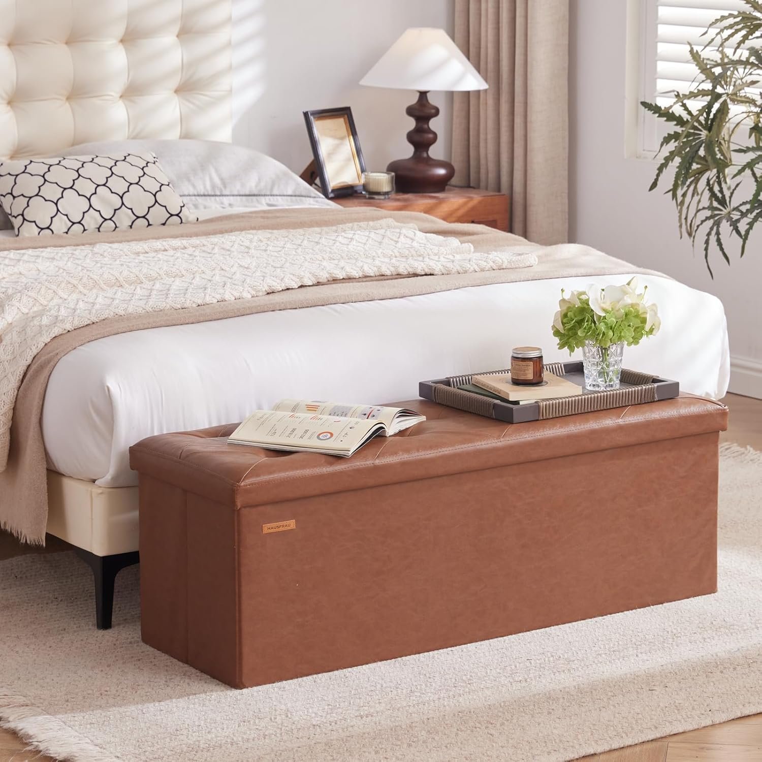 Material: The overall frame is constructed of high-quality MDF, which ensures a high load bearing capacity without easy deformation, compliant with US EPA TSCA TITLE VI standards. Besides, the soft fabric covering and thick padded seat provide a great sitting experience. Roomy interior storage space can meet the needs of storing clothes, blankets, shoes and other daily necessities.