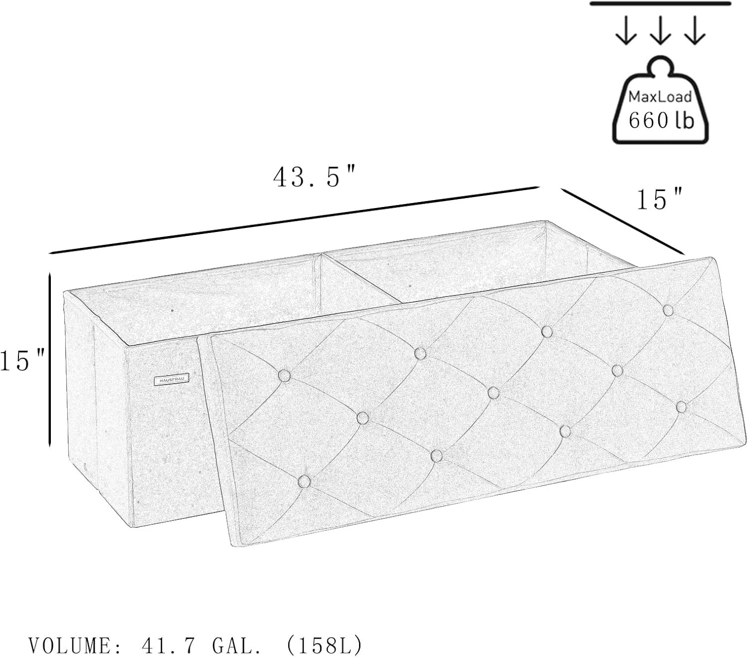 - ??Value Pack??: Specifications: Overall – 31.5″ L x 13″ W x 13″ H; Folding – 31.5″ L x 13″ W x 2.3″ H; Capacity: 72L; Max. Static Load Capacity: 286 lbs; With the flip-up lid design, one removable storage bin is also included.
