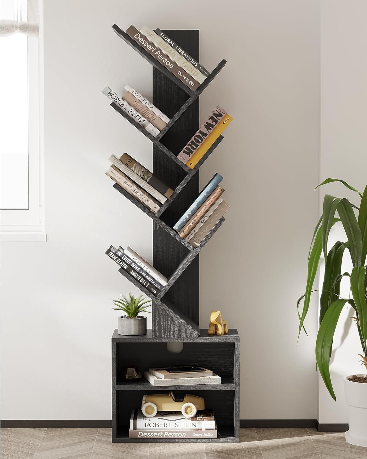 • ??Value Pack??: Small Bookshelf for Small Spaces: Featuring a compact design, the floor standing tree bookshelf optimizes floor space, making it an excellent choice for bedrooms, home offices, corners, hallways, or smaller living rooms. This narrow small bookcase organizer provides ample storage for books, CDs, game cassettes, decorations, and more. Keep your belongings stylishly organized, ensuring a neat and clutter-free space. ( Book shelf dimensions: 47.4″H*14.6″L*”7.9″W )