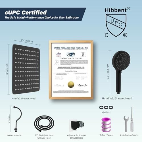 - Excellent Shower Head Combo: This hand shower combination includes a 10-inch large square rainfall shower head, a matte black-faced handheld shower head with 10 spray settings, a 71-inch metal stainless steel shower hose, a 12-inch shower head extension arm, an adhesive shower head holder, washers, Teflon tape, and an installation manual. The all-metal, solid brass stainless steel extra-long 71-inch shower hose is made of odorless EPDM material and can be used in high-temperature environments. cUPC certified, this showerhead combo meets rigorous U.S. safety and performance standards. It’s built to deliver trusted luxury and peace of mind for years to come.