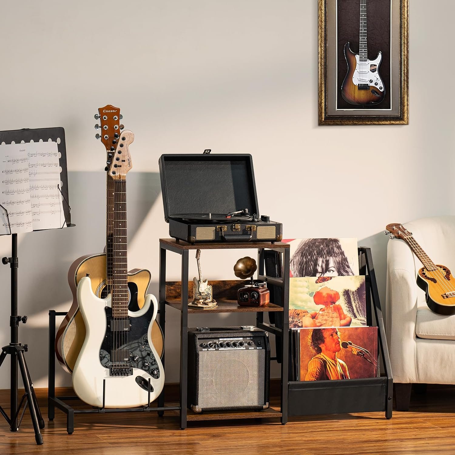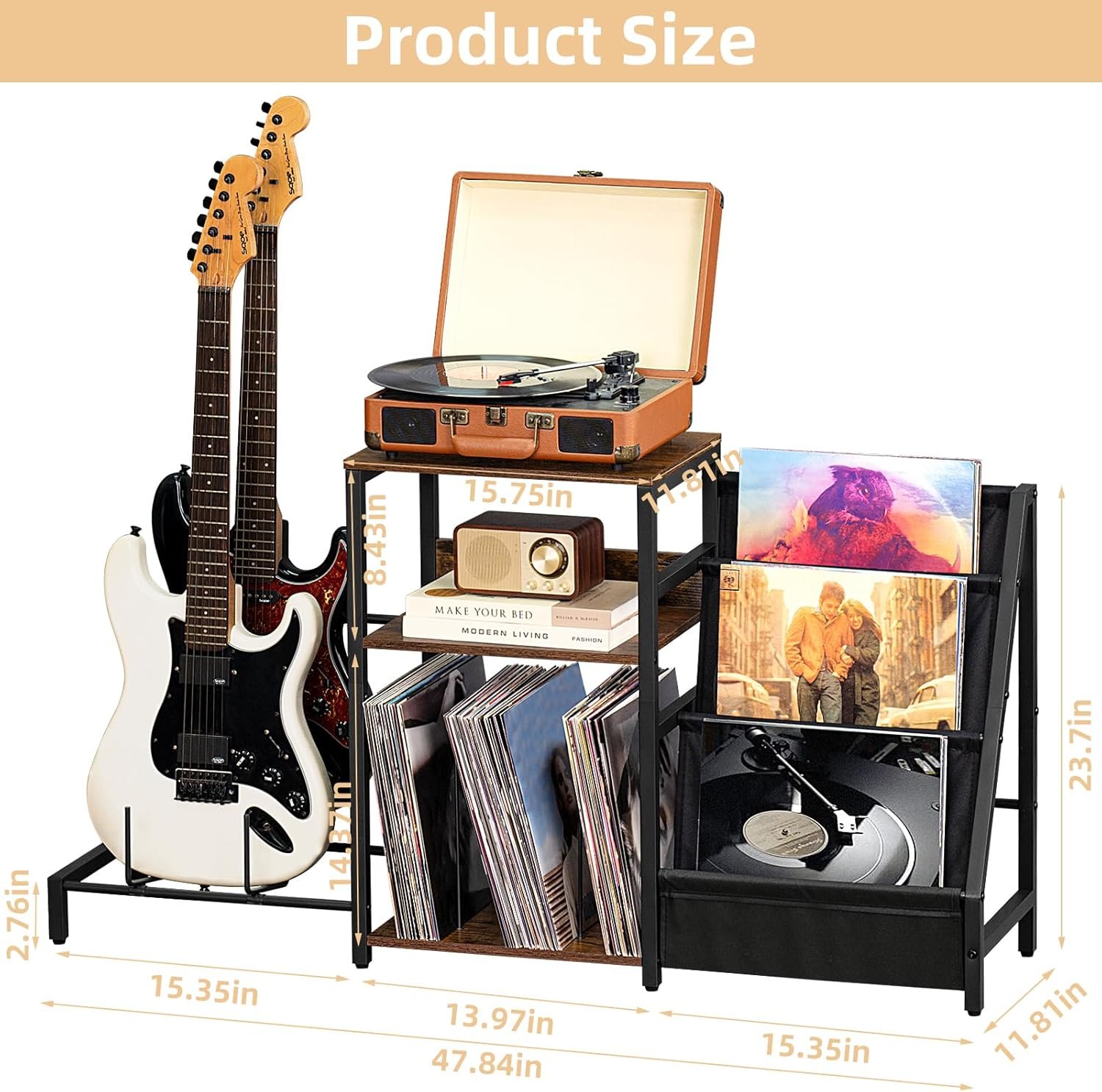 • ??Value Pack??: [ Charming Black Side Table ] The mid-century end table combines the rustic frosted black panel with metal stand, while retaining an industrial style that added a touch of elegance and mystery to your room. The two detachable U-shaped dividers on the small side table provide you with more storage options. You can categorize your books on the bottom shelf, or choose a larger single storage space for your collections, plants etc.[ Record Player Stand ] The black rustic record player stand has 3 tiers. The spacious tabletop is suitable for multiple sized record players. The 2nd and 3rd open storage shelves can hold all kinds of records and media essentials, storing up to 100 albums. The categorized storage of vinyl records holder combines art and practicality, filling your room with artistic atmosphere and keeping neatness.[ Your Storage Assistant ] These bed side tables are made of durable and sturdy wooden boards, corrosion and rust resistant metal frame, which ensures a longer usage. The sturdy bedside table also can serve as a storage cabinet for bedroom, living room, kitchen and other small spaces. You can also place it next to the sofa and pick up the delicious cake on the table to enjoy a wonderful home time when you are resting.(Narrow night stand size: 11.81 “D x 15.86 “W x 25.67 “H)[ Thoughtful Details ] The classic rectangular frame of the display storage shelf and lightweight design helps you move and carry it more easily. And we set up iron net and small wooden boards that can prevent the magazines, records and items from falling off on the 2nd and 3rd open shelves of the turntable stand . We also designed adjustable feet to help the skinny nightstand stay level on uneven floors.[ Thicker Packaging & Easy to Assemble ] We pack these slim record player stands in thicker foam and tough cardboard boxes to ensure they arrive in good conditions. These office side tables come with detailed instructions, labeled parts and assembly tools to help you assemble the album organizer shelf more easily.