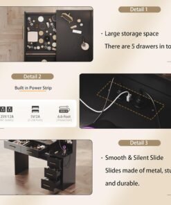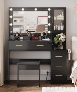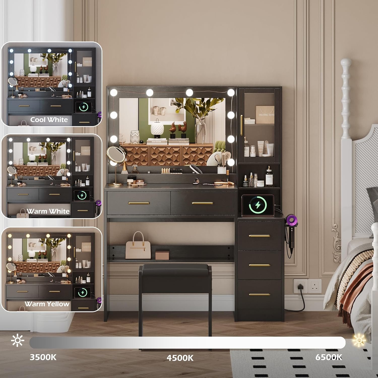 Makeup Vanity with Lights & Charging Station, Black Vanity Table with 5 Drawers & Open Storage Shelves, Bedroom Makeup Dressing Table Set for Women Girls Golden Handles