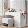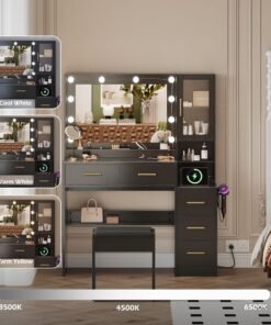 - ??Makeup Vanity with Lights in 3 Colors?? Black vanity comes with 10 lights bulbs can be switched 3 different color temperature (cold white/ warm white/warm yellow), providing you with the perfect ambiance for your makeup and daily skin care. And the brightness of each color can be adjusted. Meet your needs for different environments and makeup looks. For home make up, salon or live broadcast.