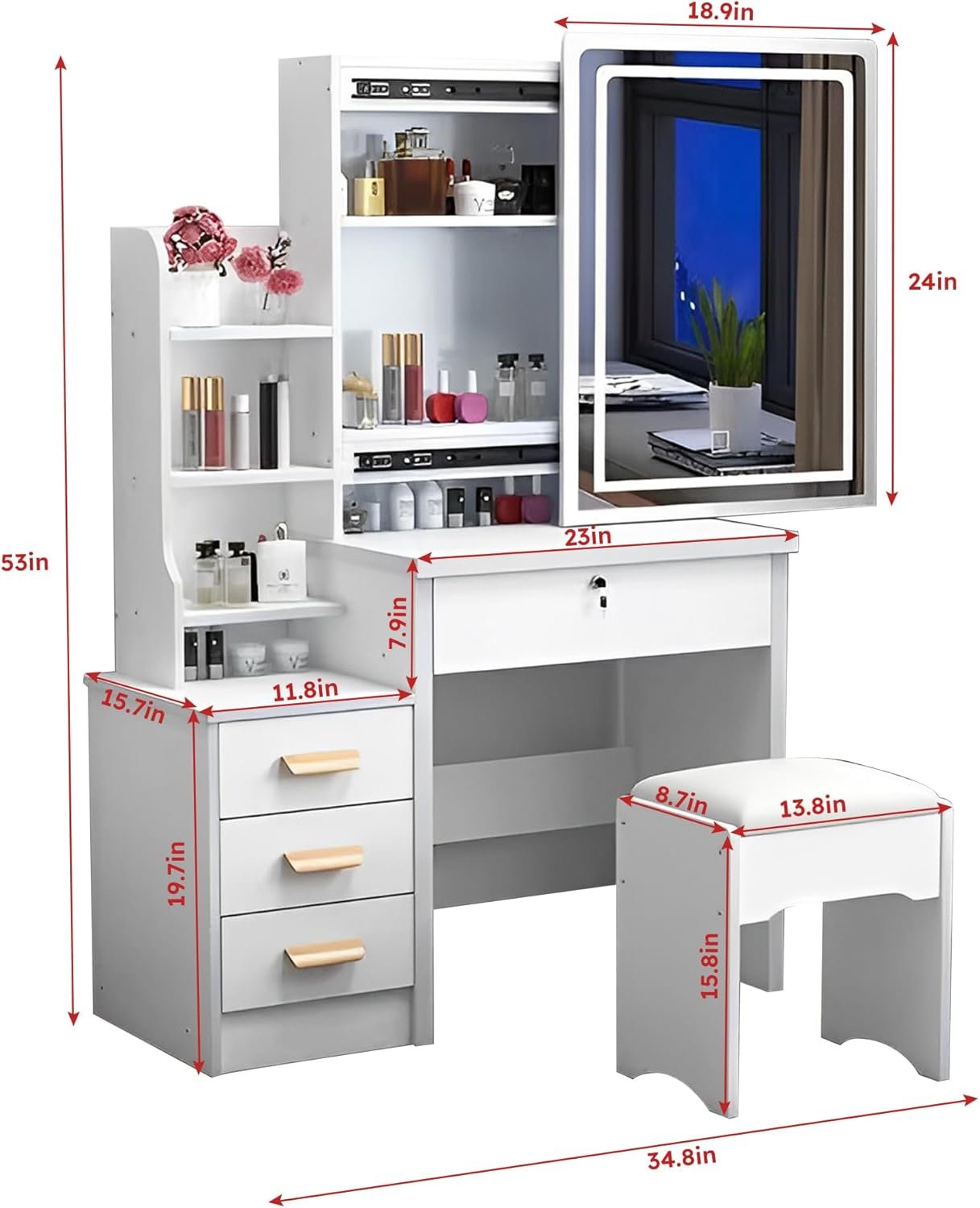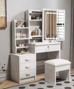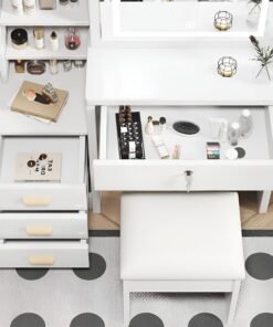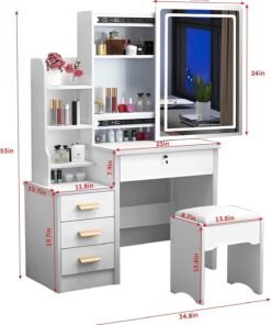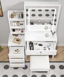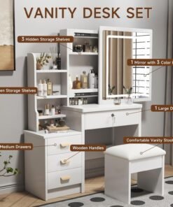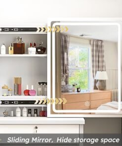 - Multifunctional & Storage Convenience — This vanity desk set has enough makeup area and comes with 4 drawers, 3 hidden storage spaces and 4 open shelves, multi-size storage space can meet different storage needs for cosmetics, decorations and various jewelry.